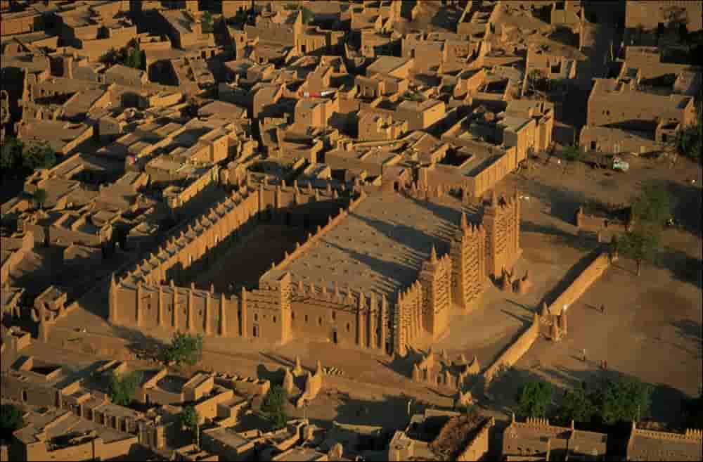 Χτίστηκε το 1907 και είναι η μεγαλύτερη κατασκευή από λάσπη του κόσμου. Το 1998 συμπεριλήφθηκε στον κατάλογο μνημείων παγκόσμιας πολιτιστικής κληρονομιάς από την UNESCO. Αυτή τη στιγμή, το τζαμί είναι κλειστό για τους τουρίστες. Πιστεύεται, πως αυτή η απόφαση πάρθηκε το 1996 μετά από σκανδαλώδεις φωτογραφήσεις του περιοδικού Vogue στα τείχη του ναού.