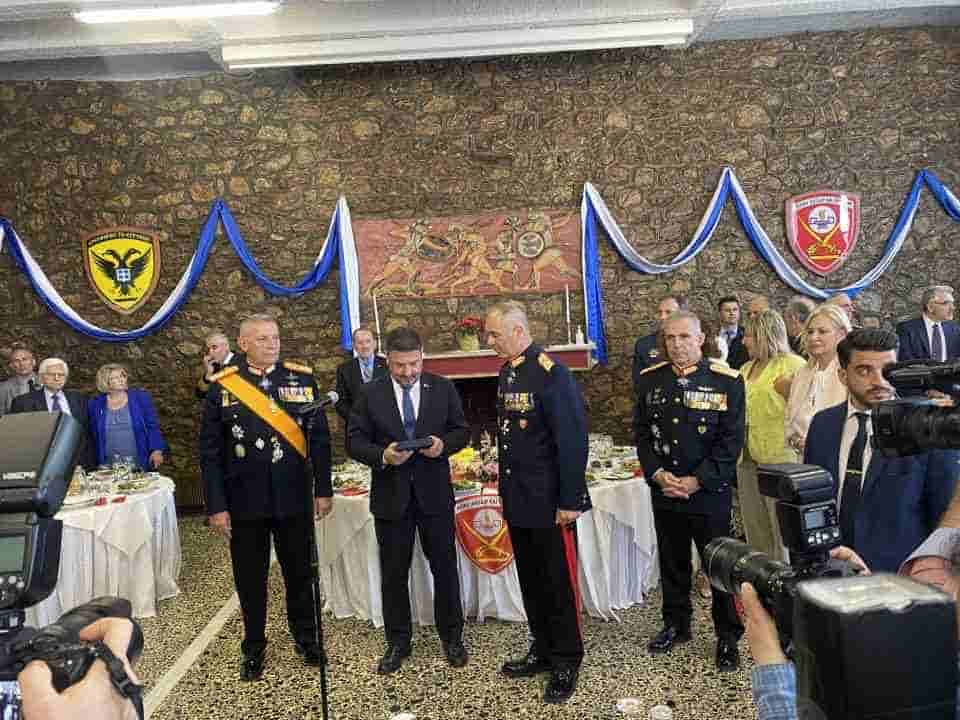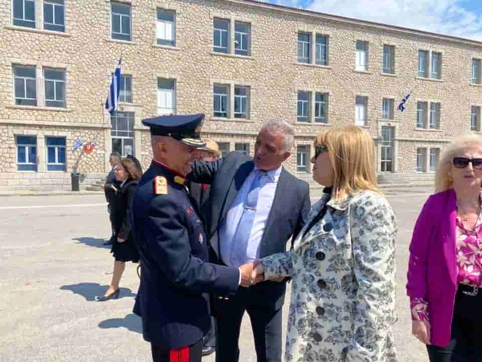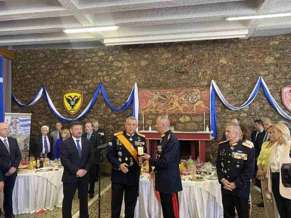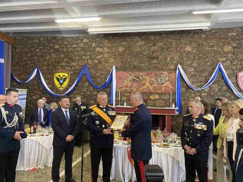 Ο Διοικητής της Σχολής Πεζικού Υποστράτηγος Κωνσταντίνος Τακόπουλος ως οικοδεσπότης και διοργανωτής του εορτασμού, προσέφερε την εικόνα του τιμώμενου Αγίου Γεωργίου στον Υφυπουργό κ. Χαρδαλιά και στον Αρχηγό ΓΕΕΘΑ Στρατηγό Φλώρο Κωνσταντίνο, ο οποίος εν συνεχεία του ανταπέδωσε τιμητική πλακέτα.