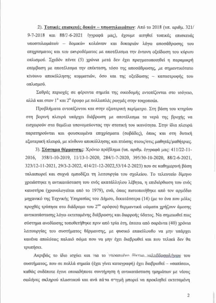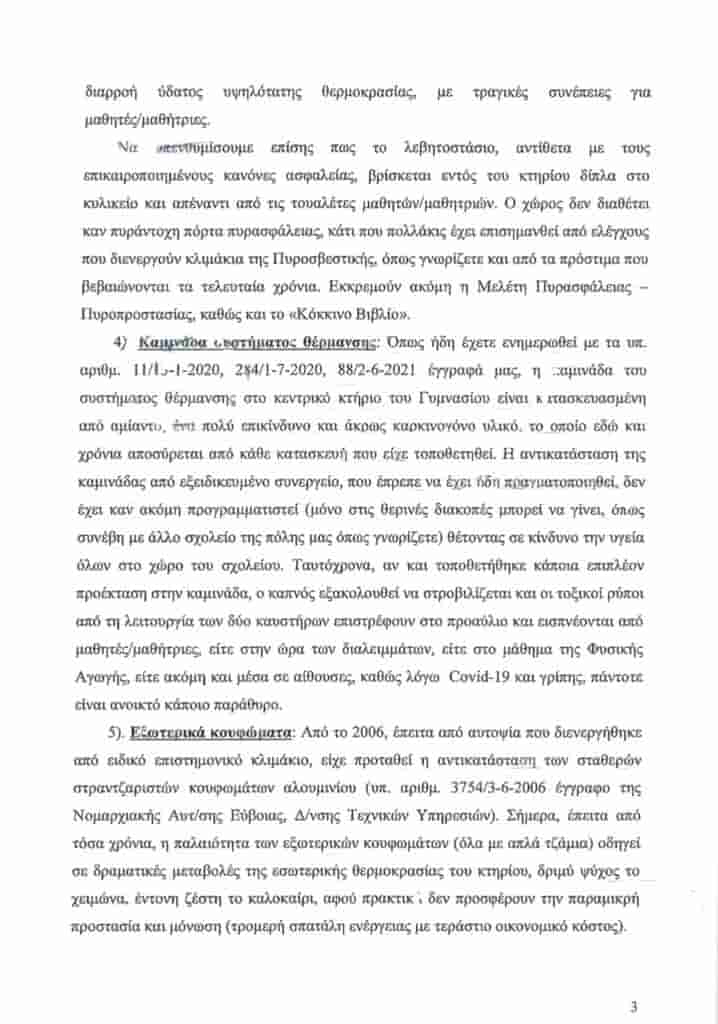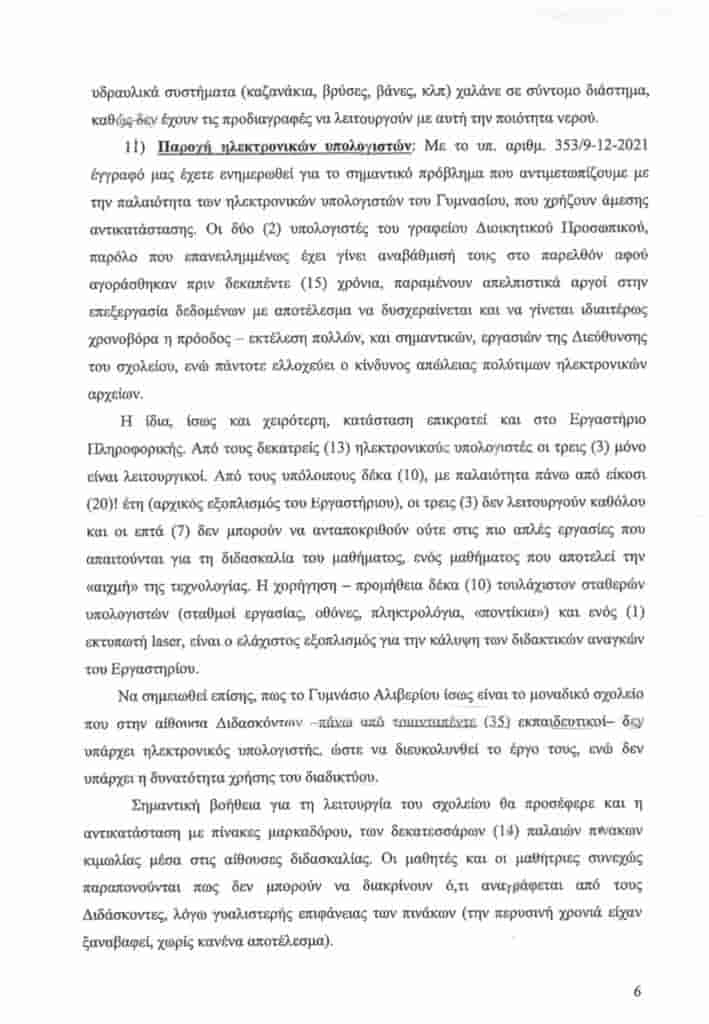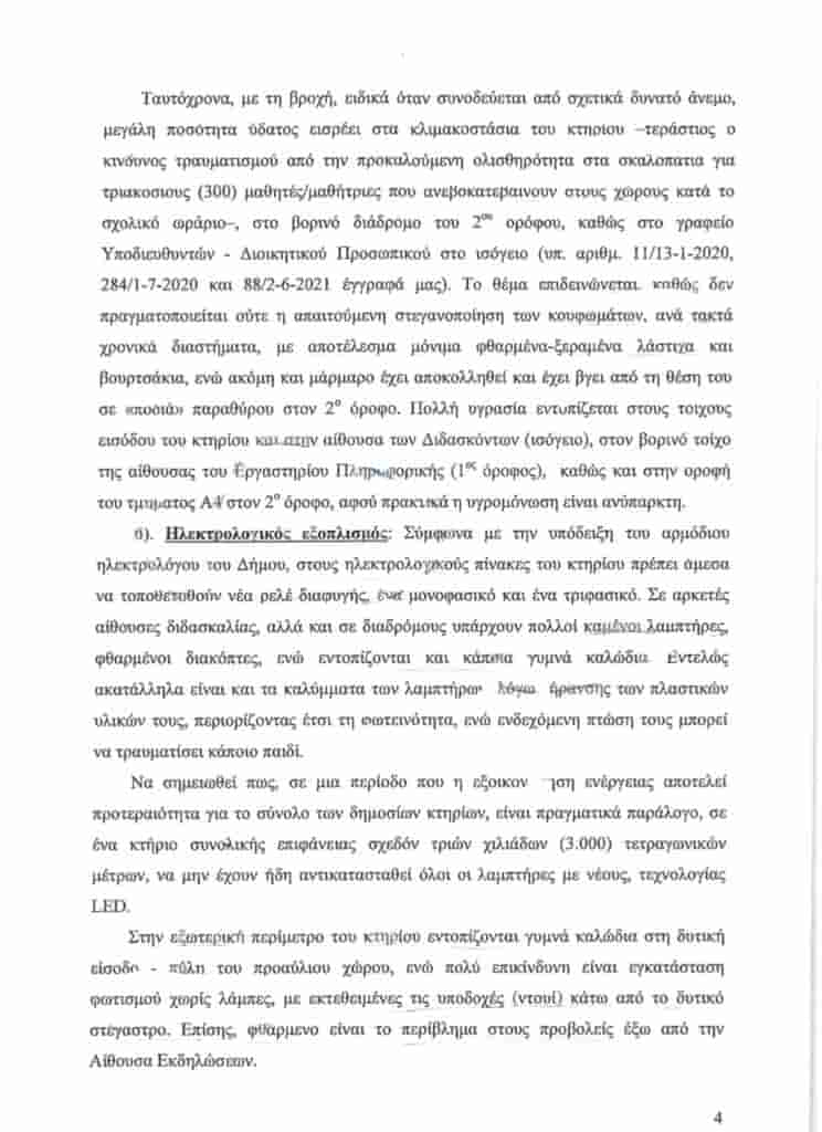 Μάλιστα ο κ. Βλάχος στάθηκε παραδειγματικά στην εφτασέλιδη επιστολή κόλαφος, του Διευθυντή του Γυμνασίου Αλιβερίου, κου Μεγαρίτη Γεώργιου, με θέμα ” Κτηριακή Υποδομή Γυμνασίου”, όπου ο Διευθυντής καταγράφει και ενημερώνει την Τεχνική Υπηρεσία του Δήμου αλλά και την Β/θμια Σχολική Επιτροπή, για τα μεγάλα προβλήματα που παρουσιάζει το κτήριο του Γυμνασίου Αλιβερίου, τα οποία είναι εμφανώς άκρως επικίνδυνα για την υγεία και την ασφάλεια των μαθητών αλλά και του εκπαιδευτικού προσωπικού. Καμία τέτοιου είδους ενημέρωση δεν τέθηκε υπόψιν των μελών της επιτροπής, διαμαρτυρήθηκε ο κ. Βλάχος ενώ τα στοιχεία που ακούστηκαν άφησαν εμβρόντητους την πλειοψηφία των Δημοτικών Συμβούλων, που τα αγνοούσε παντελώς.