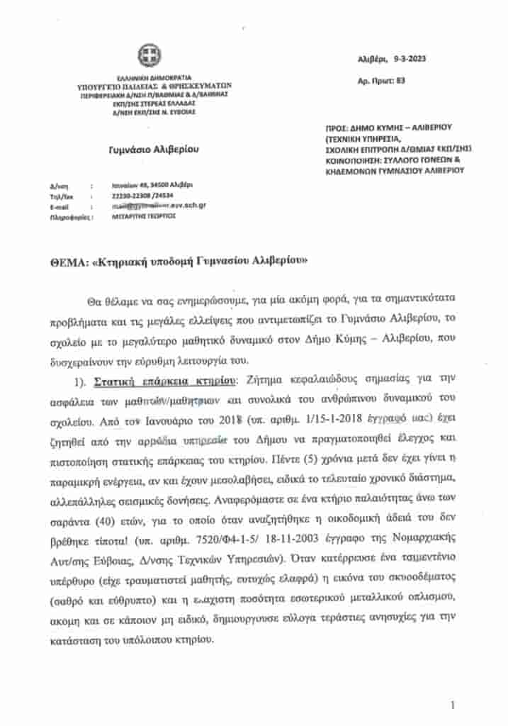 ΕΠΙΣΤΟΛΗ ΓΥΜΝΑΣΙΑΡΧΗ ΑΛΙΒΕΡΙΟΥ 9-3-2023