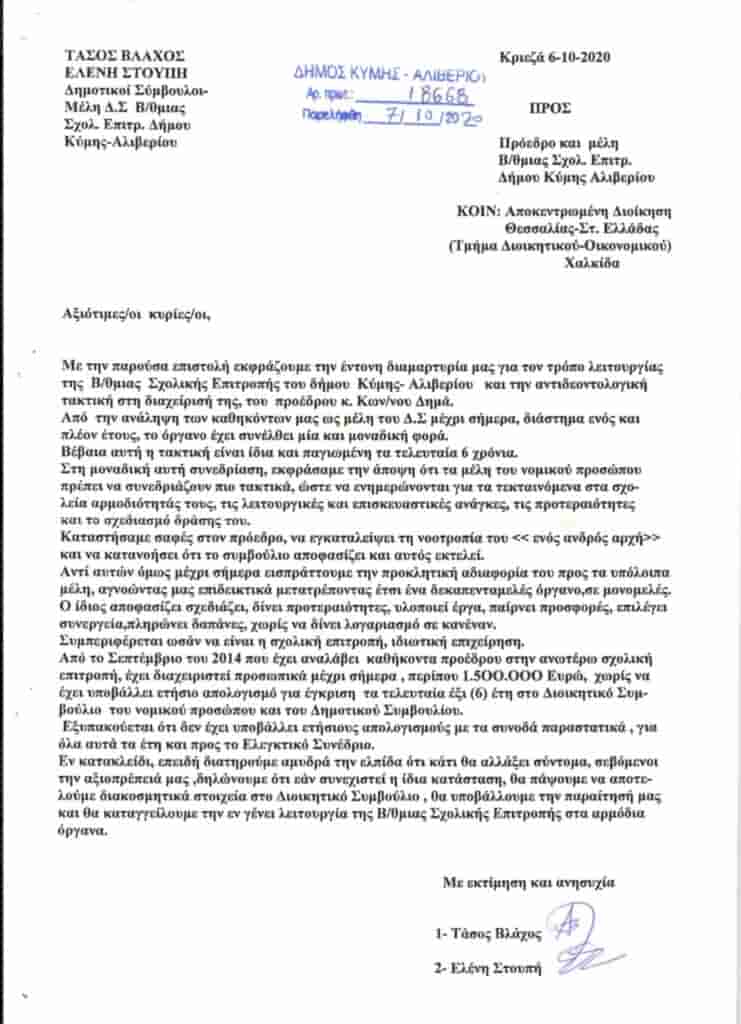 Παραιτήθηκαν οι Δημοτικοί Σύμβουλοι της μείζονος αντιπολίτευσης του Δήμου Κύμης Αλιβερίου, κα Ελένη Στουπή και κ. Αναστάσιος Βλάχος, από μέλη της Β/θμιας Σχολικής Επιτροπής, επικαλούμενοι και διαμαρτυρόμενοι για αντιδεοντολογικό τρόπο διαχείρισης του Προέδρου της, Αντιδημάρχου κου Κωνσταντίνου Δημά.