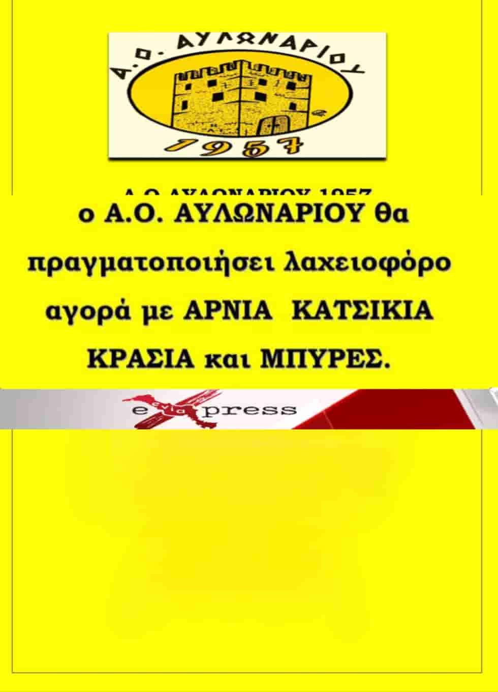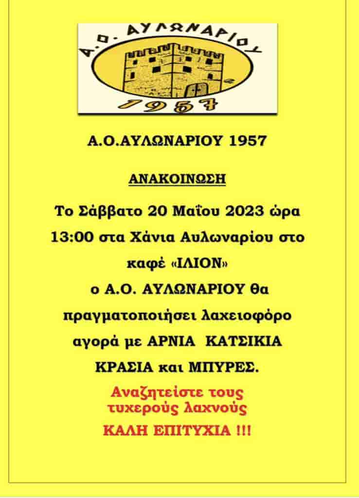 Το Σάββατο 20 Μαΐου 2023 στη 13:00 μμ ο Α.Ο Αυλωναρίου πραγματοποιεί λαχειοφόρο αγορά με αρνιά κατσίκια κρασιά και μπύρες, στο καφέ «ΙΛΙΟΝ» στα Χάνια Αλιβερίου.
