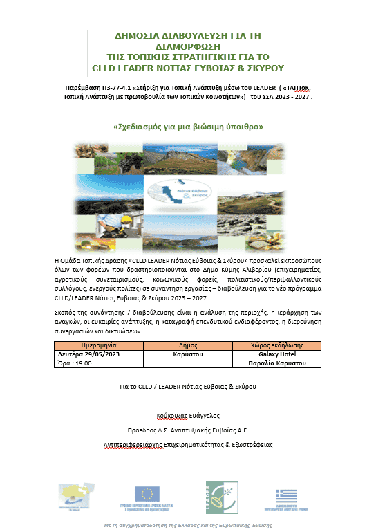 Στο πλαίσιο της διαβούλευσης για την εκπόνηση του Τοπικού Προγράμματος και της Τοπικής Στρατηγικής του CLLD LEADER Νότιας Εύβοιας & Σκύρου 2023-2027 οι ημερίδες διαβούλευσης συνεχίζονται.