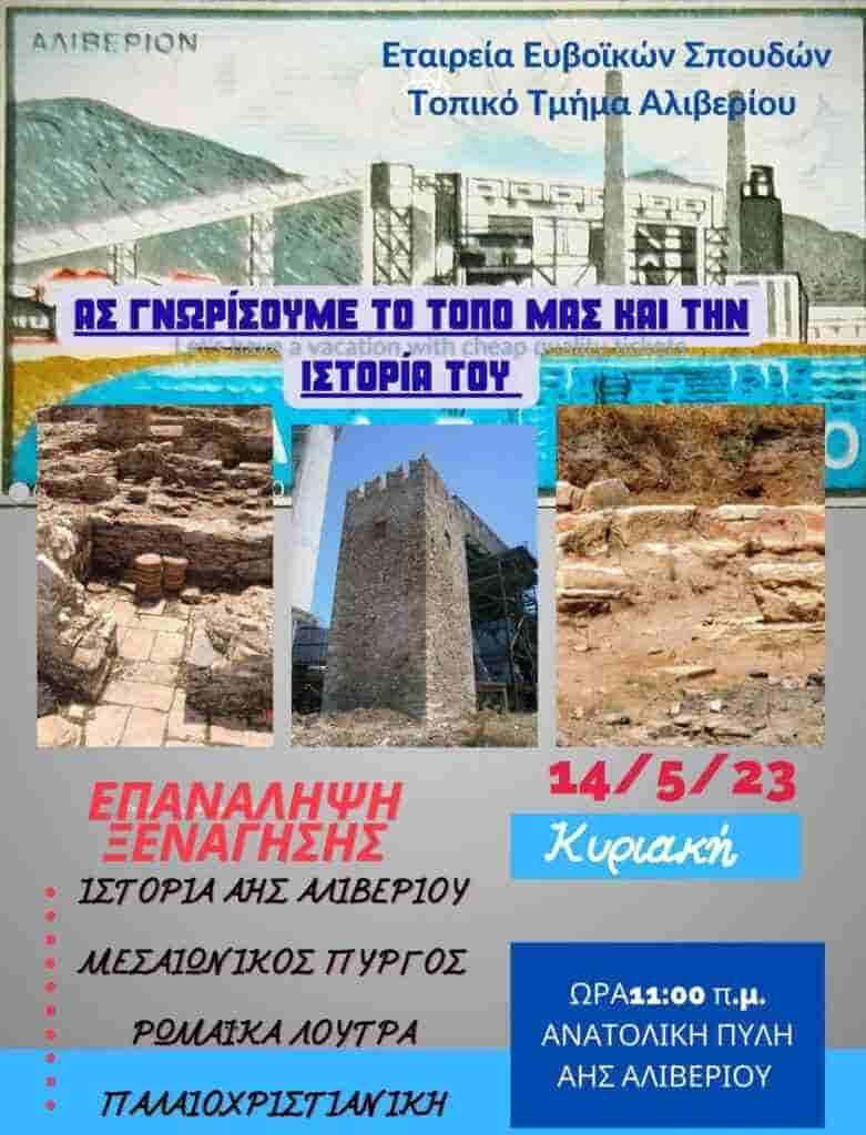 Το τοπικό τμήμα Αλιβερίου της Εταιρείας Ευβοϊκών Σπουδών ανακοινώνει και προσκαλεί στη νέα ξανάγηση που θα πραγματοποιηθεί στον ΑΗΣ την Κυριακή 14 Μαΐου.