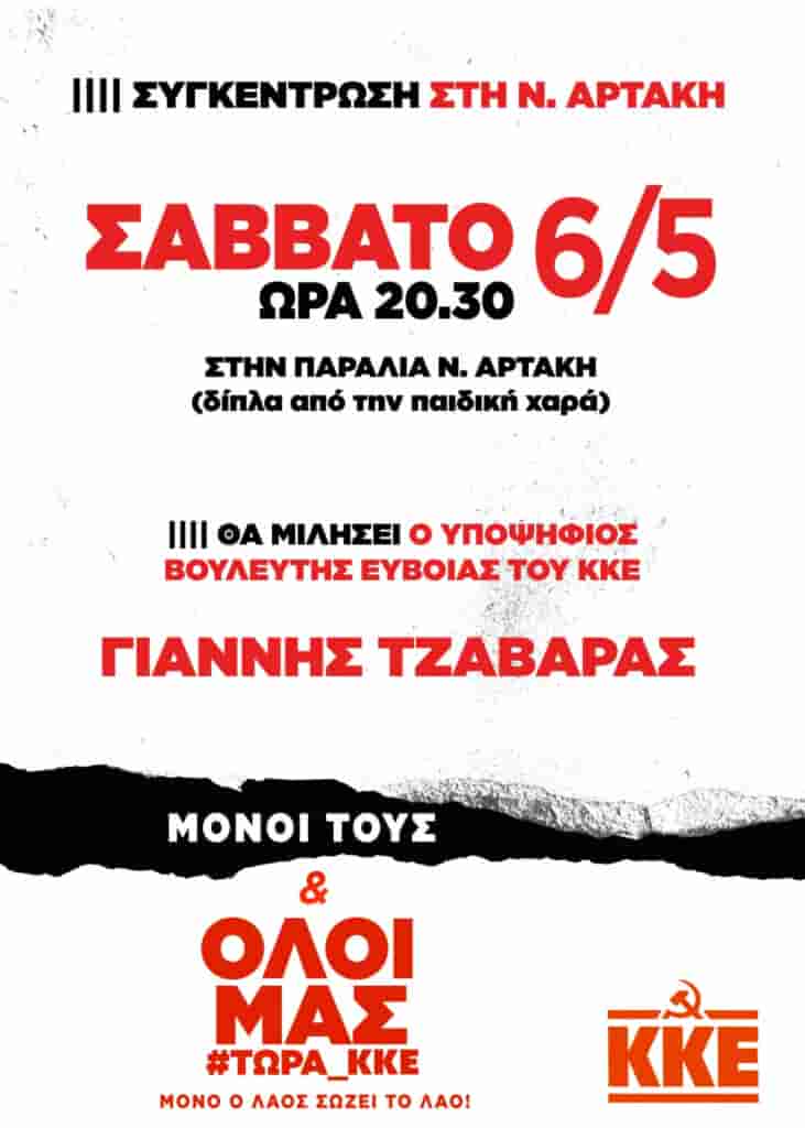 Η Κομματική Οργάνωση Ν. Αρτάκης του ΚΚΕ διοργανώνει συγκέντρωση το Σάββατο 6 Μάη, στις 20:30, στην παραλία Ν. Αρτάκης (δίπλα από την παιδική χαρά).