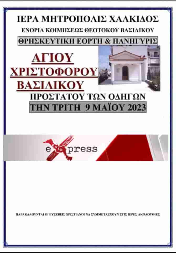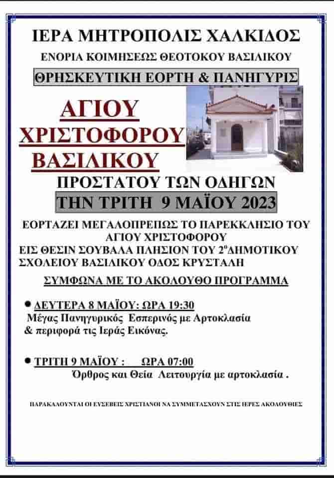 Την Δευτέρα 8 Μαΐου και ώρα 19:30 μμ Μέγας Πανηγυρικός Εσπερινός με αρτοκλασία και περιφορά της εικόνας του Αγίου Χριστοφόρου προστάτη των οδηγών.