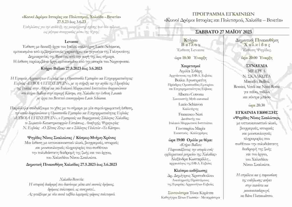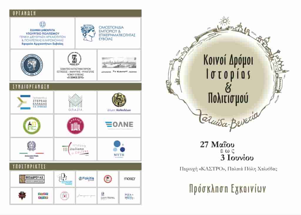 Η Εφορεία Αρχαιοτήτων και η Ομοσπονδία Εμπορίου και Επιχειρηματικότητας Εύβοιας «ΕΥΒΟΙΑ ΕΠΙΧΕΙΡΕΙΝ», με τη στήριξη και την αιγίδα της Πρεσβείας της Ιταλίας στην Αθήνα και του Ιταλικού Μορφωτικού Ινστιτούτου διοργανώνουν στο κτήριοΒαΐλου στην περιοχή Κάστρο, στη Χαλκίδα