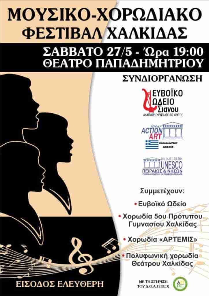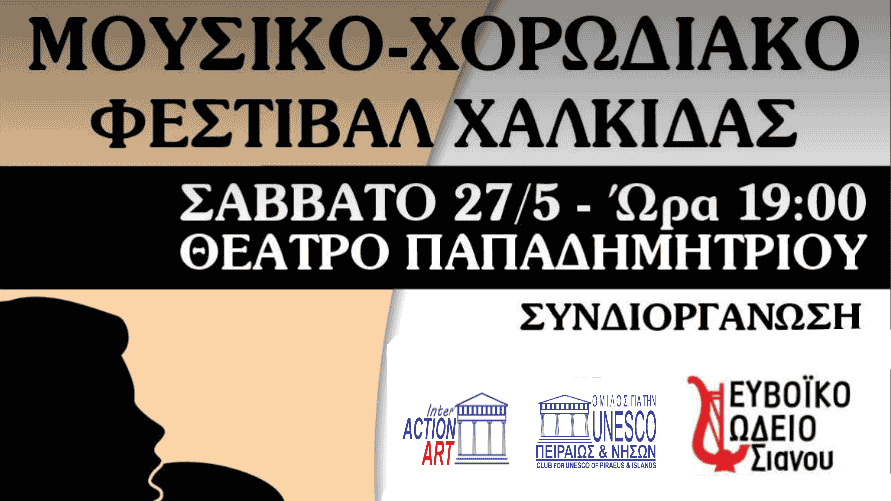 Το Σάββατο 27 Μαΐου στις 7:00 η ώρα το απόγευμα στο Θέατρο Παπαδημητρίου στη Χαλκίδα θα πραγματοποιηθεί Μουσικοχορωδιακό Φεστιβάλ, υπό την συνδιοργάνωση του Παραρτήματος Εύβοιας της International Action Art του Ομίλου για την UNESCO και του Αναγνωρισμένου από το κράτος Ευβοϊκού Ωδείου Σιάνου.