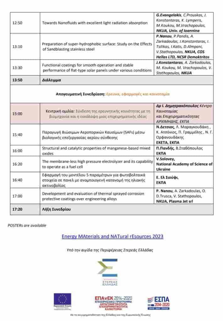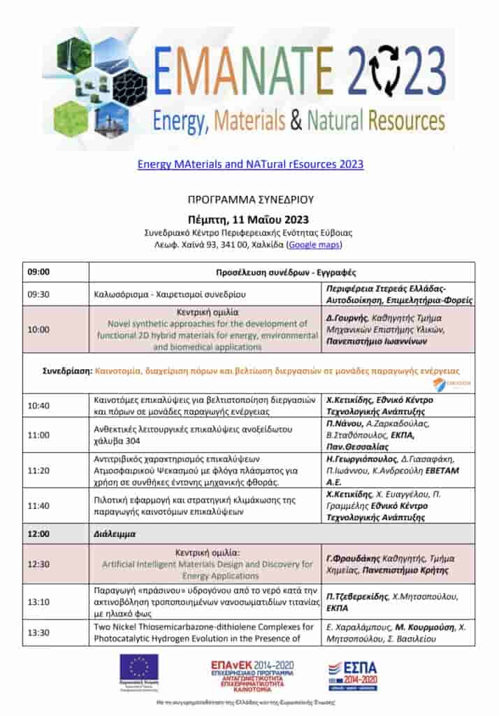 Συνέδριο με τίτλο: «Energy MAterials and NATural rEsources (EMANATE)» διοργανώνει στη Χαλκίδα, στις 11 και 12 Μαΐου 2023, το Εργαστήριο Χημείας και Τεχνολογίας Υλικών του Εθνικού και Καποδιστριακού Πανεπιστημίου Αθηνών με την υποστήριξη του Ερευνητικού Ινστιτούτου Ενέργειας ΕΚΠΑ και της Περιφέρειας Στερεάς Ελλάδας.