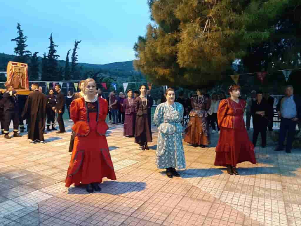 Μετά το πέρας του Πανηγυρικού Εσπερινού ακολούθησε η λιτανεία της εικόνος την οποία πλαισίωσαν η Εθελοντική Ομάδα Δασοπυρόσβευσης Αμαρυνθία Αρτεμις με τα μέλη του χορευτικού Πολιτιστικού Συλλόγου Νέας Αρτάκης.