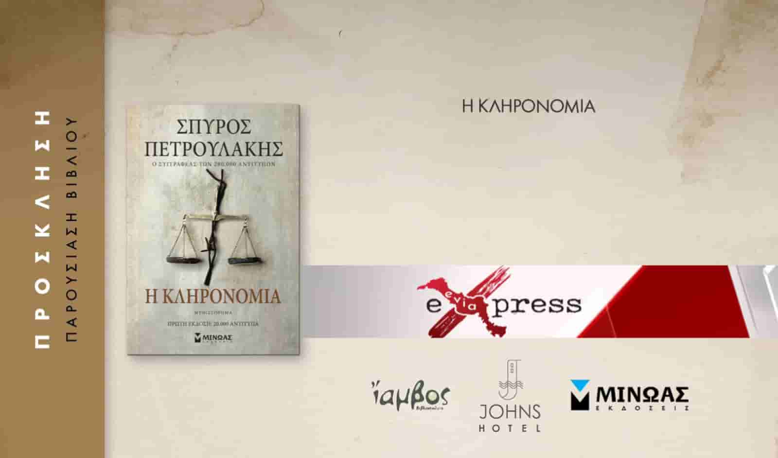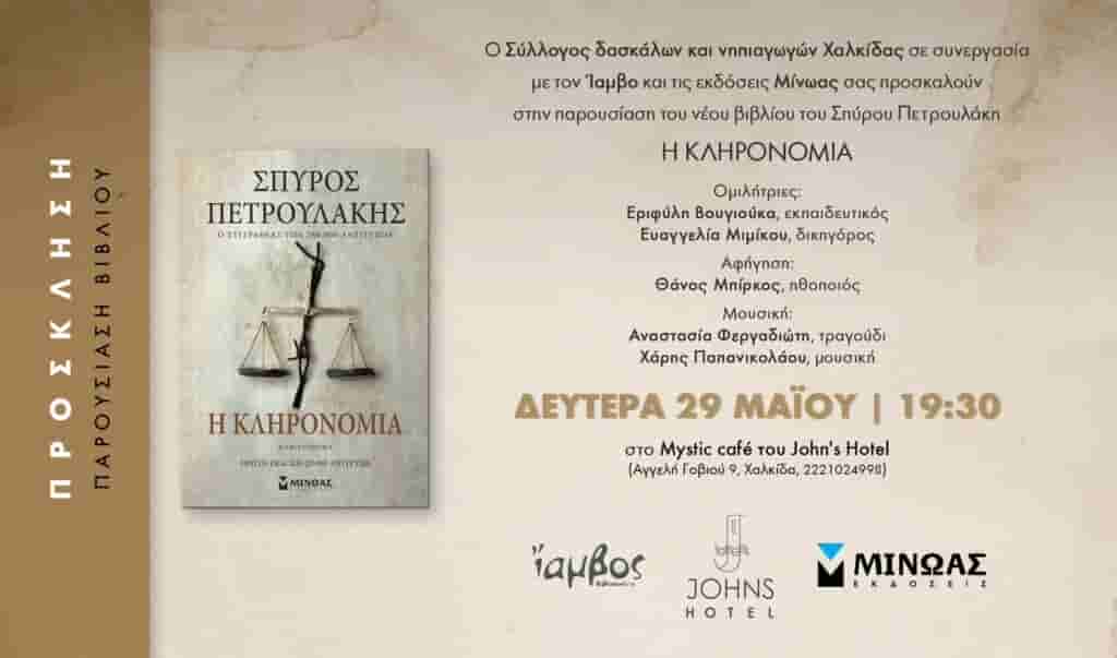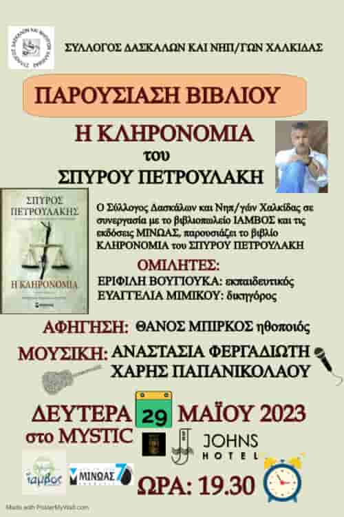 Ο Σύλλογος Δασκάλων και Νηπ/γών Χαλκίδας σας προσκαλεί στην παρουσίαση του νέου βιβλίου του Σπύρου Πετρουλάκη “ΚΛΗΡΟΝΟΜΙΑ” τη ΔΕΥΤΕΡΑ 29-5-2023 και ώρα 19.30 στο MYSTIC cafe (JOHN’S HOTEL)