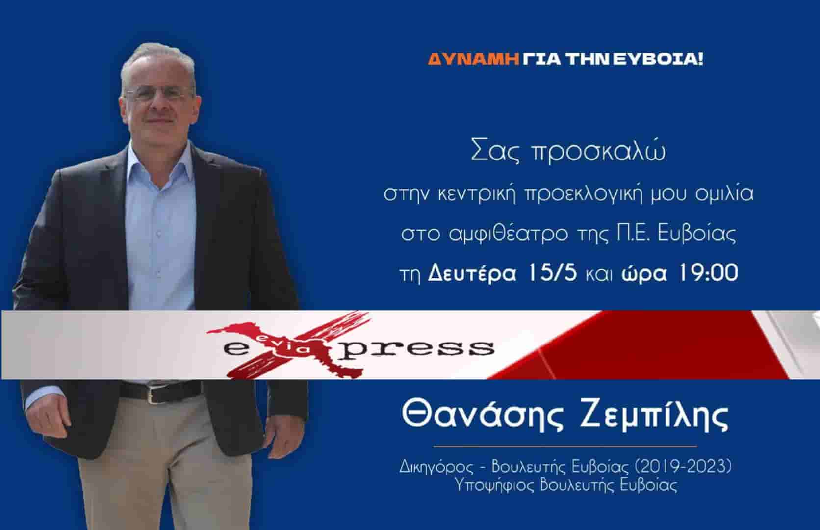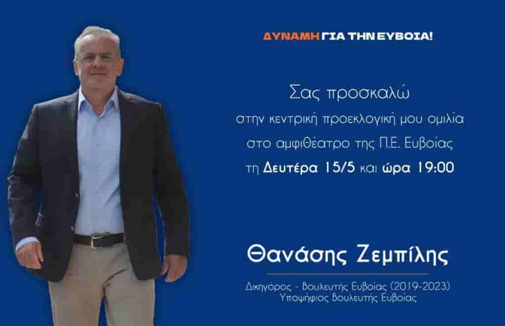 Την κεντρική προεκλογική του ομιλία θα πραγματοποιήσει τη Δευτέρα 15/5 και ώρα 19:00 στο αμφιθέατρο της Περιφερειακής Ενότητας Εύβοιας, Λεωφόρος Χαϊνά 93, ο υποψήφιος βουλευτής Θανάσης Ζεμπίλης.