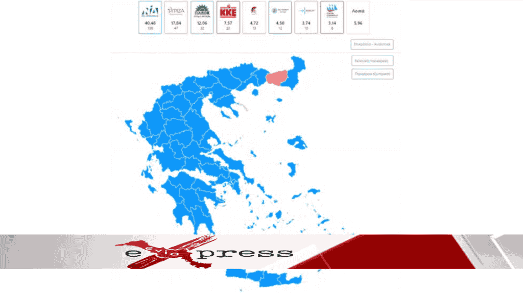 Σαρωτική νίκη της Νέας Δημοκρατίας με διαφορά μεγαλύτερη του 22% διαφορά από τον ΣΥΡΙΖΑ και ισχυρή αυτοδυναμία δίνουν τα πρώτα αποτελέσματα Επικρατείας του Υπουργείο Εσωτερικών για τις σημερινές εκλογές της 25ης Ιουνίου στο 82,53% της ενσωμάτωσης.