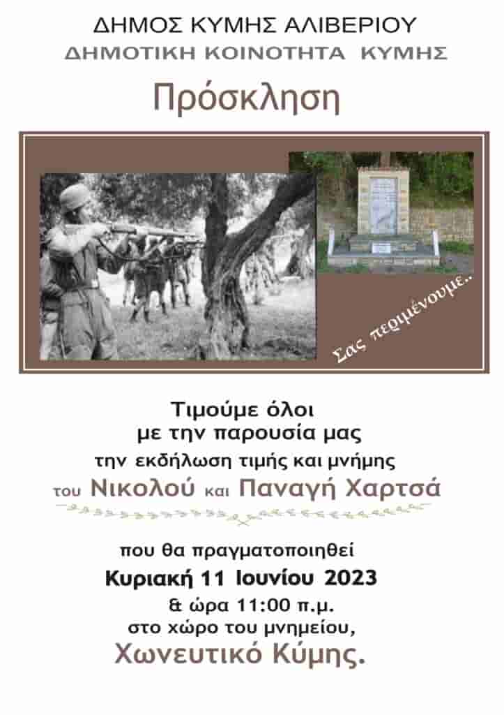 Tην Κυριακή 11 Ιουνίου 2023, στις 10.45 η ώρα το πρωί θα πραγματοποιηθεί στην Κύμη και στην τοποθεσία Χωνευτικό εκδήλωση προς τιμήν των Αδερφών Χαρτσά.