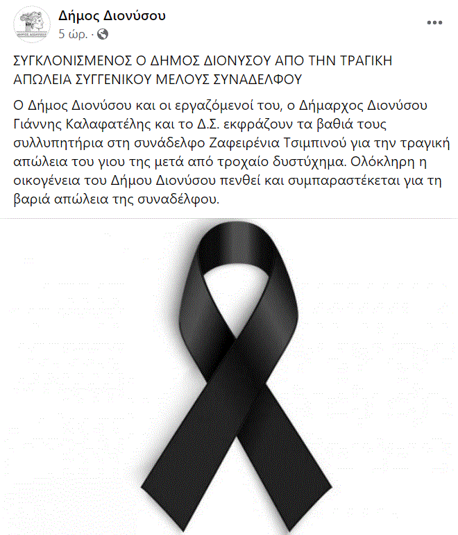 Ο δήμος Διονύσου και οι εργαζόμενοι του, ο δήμαρχος Διονύσου Γιάννης Καλαφατέλης και το Δ.Σ εκφράζουν τα βαθιά τους συλλυπητήρια στην συνάδελφο Ζαφειρένια Τσιμπινού για την τραγική απώλεια του γιου της μετά από το τροχαίο δυστύχημα.
