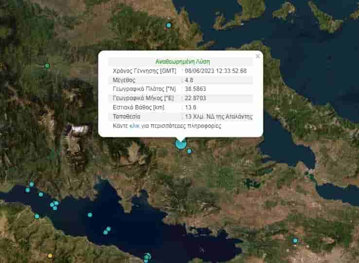 Σύμφωνα με την αναθεωρημένη λύση του Γεωδυναμικού Ινστιτούτου Αθηνών, έντονη σεισμική δραστηριότητα σημειώθηκε το απόγευμα της Πέμπτης 8 Ιουνίου, με τ ο επίκεντρο του σεισμού να εντοπίζεται στα 13 χιλιόμετρα νοτιοδυτικά της Αταλάντης, ενώ το εστιακό βάθος υπολογίζεται στα 13,6 χιλιόμετρα. Δεν έχουν σημειωθεί σοβαρές ζημιές ούτε τραυματισμοί κατοίκων στις γύρω περιοχές.