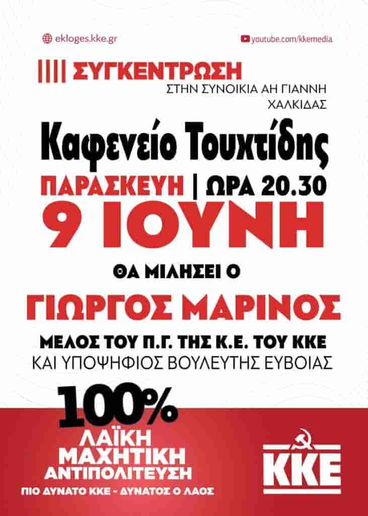 Σε σύσκεψη των ΚΟ Χαλκίδας του ΚΚΕ, στο καφενείο “Τουχτίδης” στη γειτονιά του Άη Γιάννη θα μιλήσει σήμερα, Παρασκευή 9 Ιούνη, στις 8:30 μμ, ο Γιώργος Μαρίνος, υποψήφιος Βουλευτής Εύβοιας και μέλος του ΠΓ της ΚΕ του ΚΚΕ.