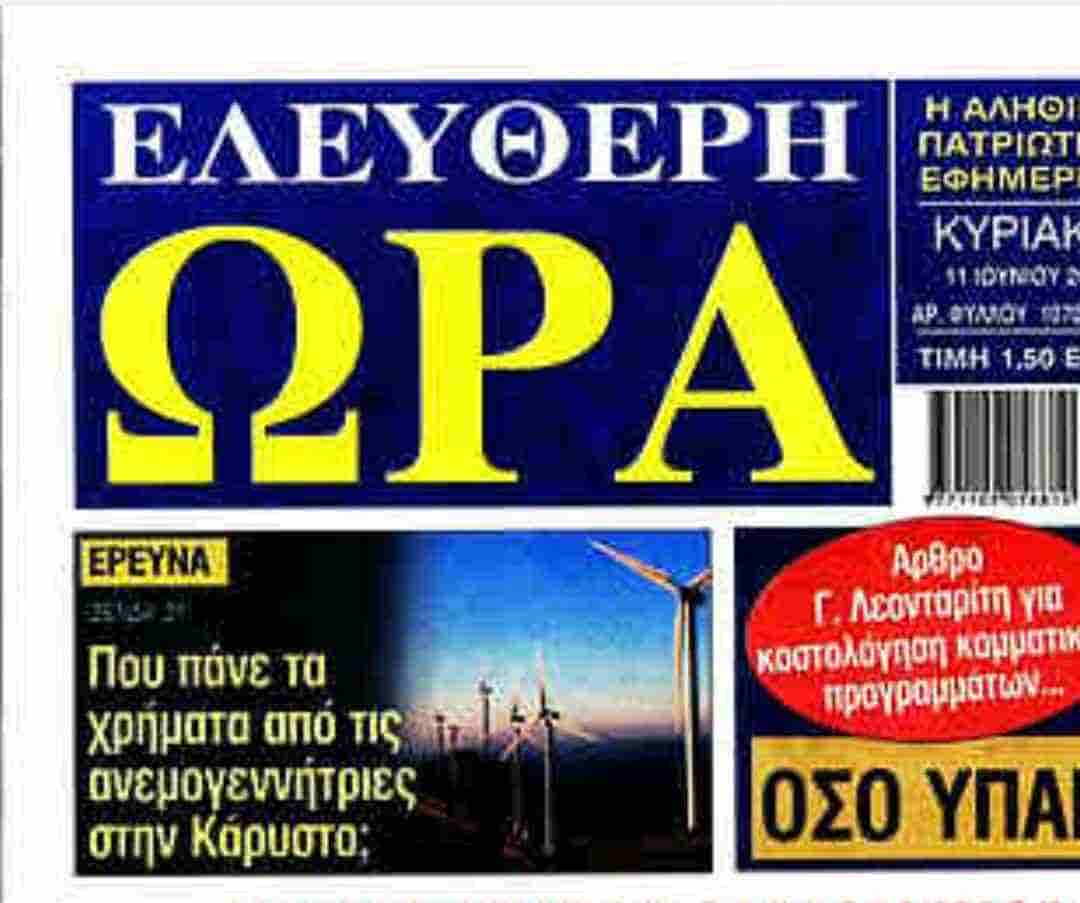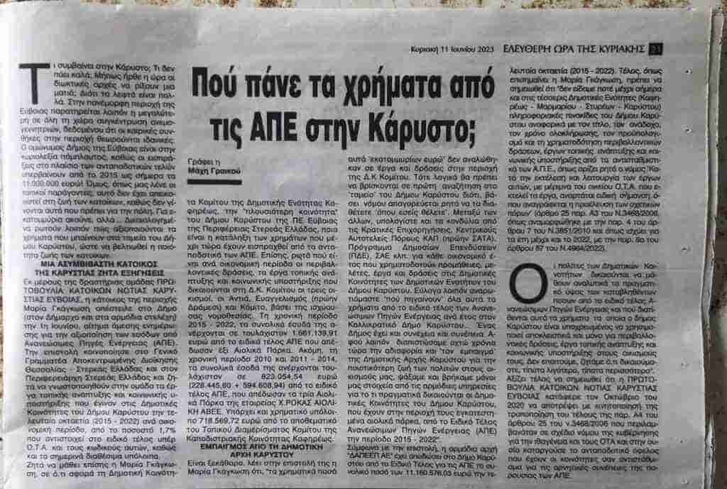 “Τα χρήματα από τις ανεμογεννήτριες στην Κάρυστο μπαίνουν στο μικροσκόπιο της Κυριακάτικης “ΕΛΕΥΘΕΡΗΣ ΩΡΑΣ ” και η Δημοσιογράφος κα Μάχη Γραπτού γράφει :
