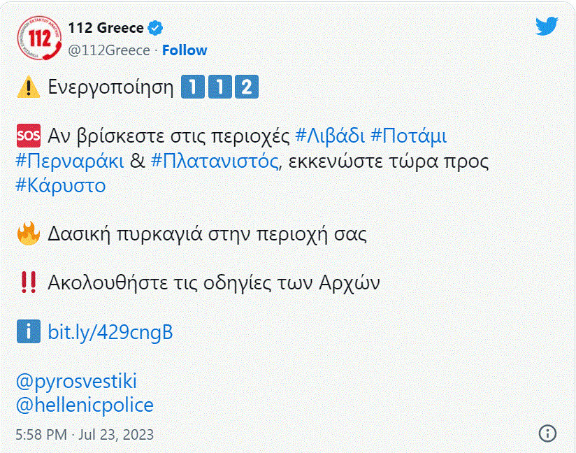 Σύμφωνα με δηλώσεις του Περιφερειάρχη κου. Φάνη Σπανού, έχει ξεκινήσει η διαδικασία εκκένωσης τεσσάρων ακόμη χωριών, μετά και το μήνυμα από το 112, για εκκένωση που έλαβαν στα κινητά τους τηλέφωνα οι κάτοικοι.