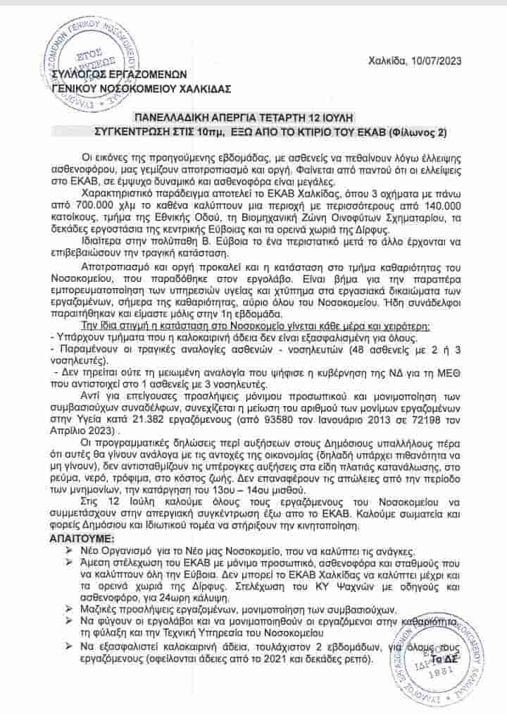 Πανελλαδική 24ωρη ΑΠΕΡΓΙΑ την Τετάρτη 12 Ιούλη Συγκέντρωση 10πμ, μπροστά από το ΕΚΑΒ.