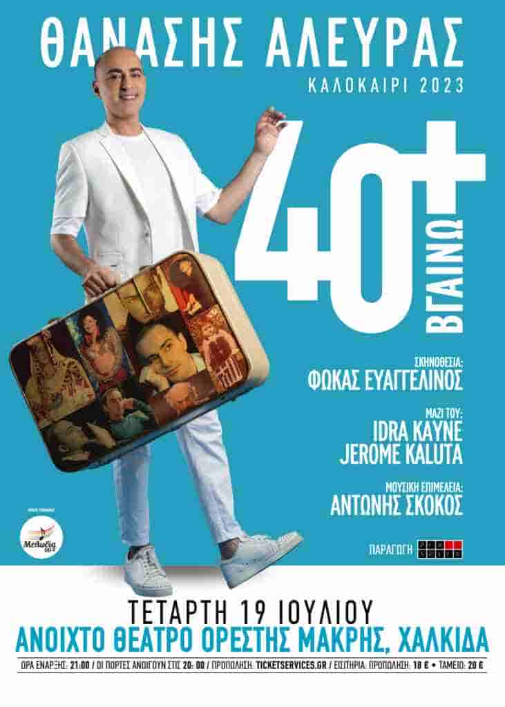 «40+ΒΓΑΙΝΩ…ΠΕΡΙΟΔΕΙΑ» την Τετάρτη 19 Ιουλίου στο Ανοιχτό Θέατρο Ορέστης Μακρής, στη Χαλκίδα με Ώρα έναρξης στις 21.00 ενώ οι πόρτες ανοίγουν στις 20.00 και η Η προπώληση συνεχίζεται