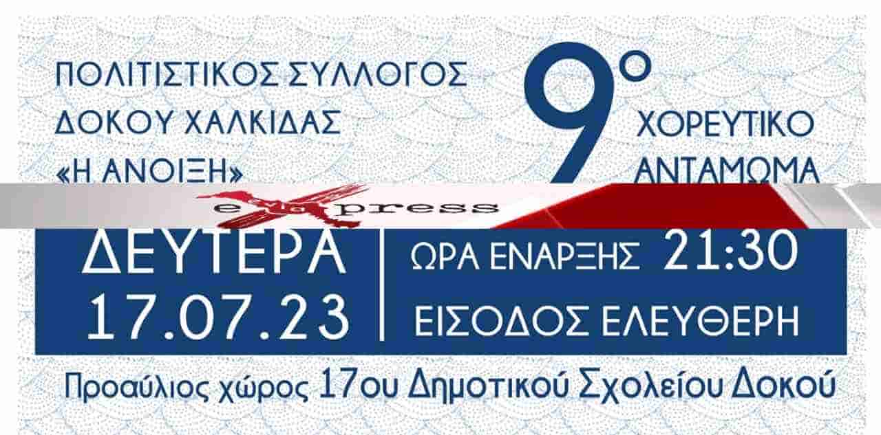 Ο Πολιτιστικός Σύλλογος Δοκού Χαλκίδας σας προσκαλούν τη Δευτέρα 17 Ιουλίου 2023 και ώρα 21:30 θα πραγματοποιηθεί το 9ο χορευτικό αντάμωμα στον προαύλιο χώρο του 17ου Δημοτικού Σχολείου Δοκού Χαλκίδας.