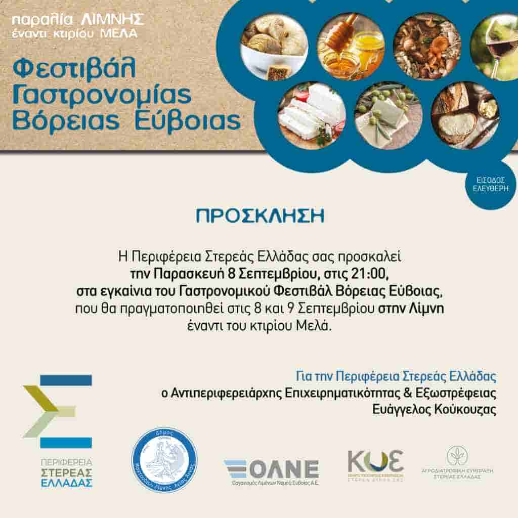 Λόγω μετεωρολογικών προβλέψεων για άστατο καιρό, η προγραμματισμένη λειτουργεία του Φεστιβάλ Γαστρονομίας Βόρειας Εύβοιας για την Πέμπτη 7 Σεπτεμβρίου δεν θα πραγματοποιηθεί. Κατόπιν αυτού, το φεστιβάλ αναδιαμορφώνεται στο διήμερο της Παρασκευής και του Σαββάτου, 8 και 9 Σεπτεμβρίου.