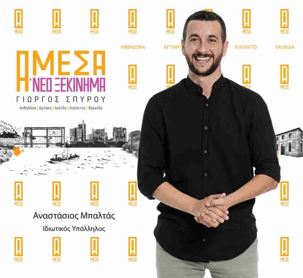 Ο Αναστάσιος Μπαλτάς γεννήθηκε το 1985. Μέχρι την ηλικία των 11 ετών μεγάλωσε στην Κάνηθο και έπειτα η οικογένεια του μετακόμισε στη έξω Παναγίτσα, όπου διαμένει μέχρι και σήμερα. Είναι απόφοιτος του τμήματος Μηχανικών πληροφορικής του ΤΕΙ ΑΡΤΑΣ. Για 6 χρόνια εργαζόταν στο χώρο της εστίασης, ενώ τα τελευταία 15 χρόνια είναι υπεύθυνος πωλήσεων σε εταιρεία τροφίμων. Είναι παντρεμένος με την Μάλλιαρη Αθήνα και έχουν αποκτήσει ένα παιδί. Η προσωπικότητα του Γιώργου Σπύρου, οι απόψεις και το πρόγραμμα για το Δήμο Χαλκιδέων ήταν οι λόγοι συμμετοχής του στον συνδυασμό «ΑΜΕΣΑ-ΝΕΟ ΞΕΚΙΝΗΜΑ».