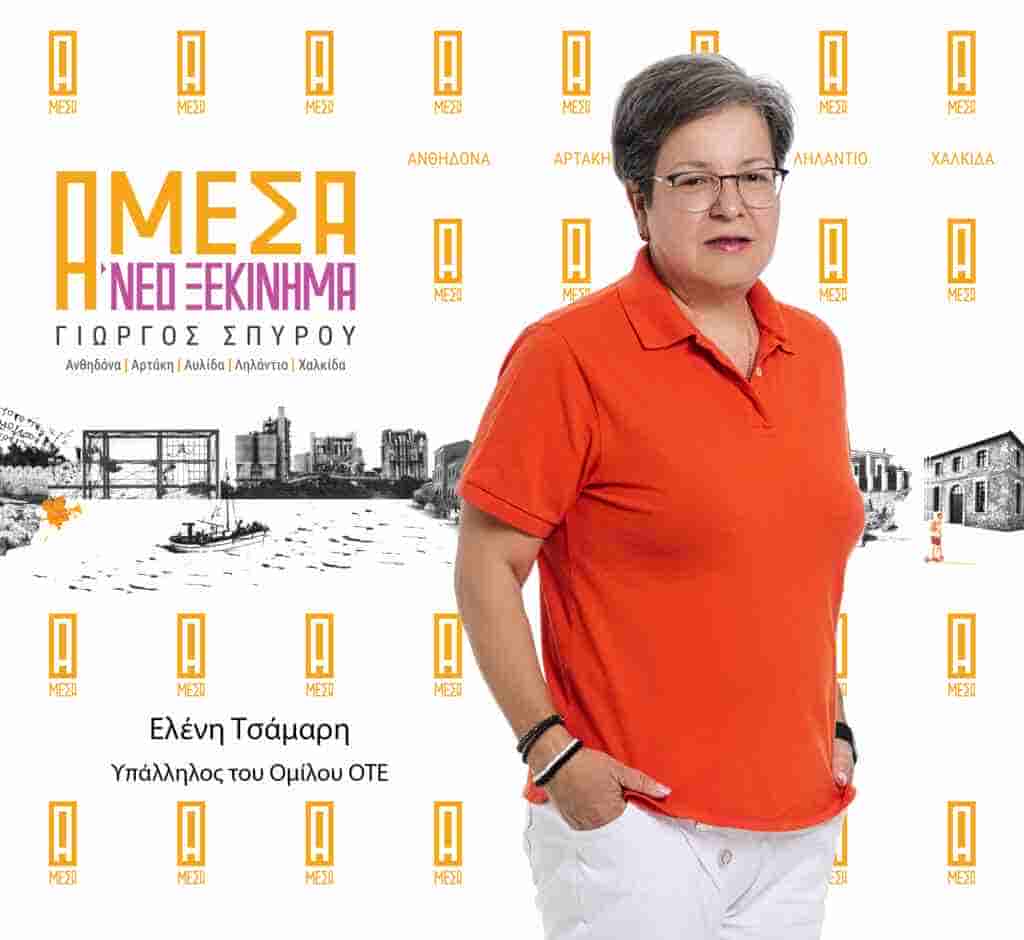 Η Ελένη Τσάμαρη γεννήθηκε στη Θεσσαλονίκη το 1967 και μεγάλωσε στη Χαλκίδα. Είναι κόρη του Μπάμπη και της Αρετής, που είχαν πρώτο καφενείο στην Αγία Βαρβάρα στη Χαλκίδα. Από το 1994 μένει μόνιμα στην Αρτάκη με το σύζυγό της Γιάννη Μπίλιο. Είναι υπάλληλος του Ομίλου ΟΤΕ από το 1988. Η ενασχόληση της με τα κοινά ξεκίνησε μέσω της συνδικαλιστικής δράσης για τα προβλήματα και τις ανησυχίες των συναδέλφων της. Διετέλεσε Πρόεδρος του συλλόγου Διοικητικών και Οικονομικών υπαλλήλων ΠΑΣΕ ΟΤΕ Εύβοιας και Βοιωτίας από το 2014 μέχρι το 2021, μέχρι που τοποθετήθηκε στη θυγατρική Cosmote Technical Service το 2021, όπου και εκλέχτηκε γραμματέας στο σωματείο των τεχνικών του νομού μας. Έχει διατελέσει εκπρόσωπος στα κεντρικά δευτεροβάθμια σωματεία καθώς και στο εργατικό κέντρο Νομού Εύβοιας. Είναι πρόεδρος στο πολιτιστικό κέντρο εργαζομένων και συνταξιούχων της Εύβοιας από το 2014 . Ασχολείται με τη θεατρική ομάδα της Αρτάκης και με παραδοσιακούς χορούς. Όραμα της είναι η πόλη της να έχει μια καλύτερη καθημερινότητα. Κατεβαίνει με το συνδυασμό «Άμεσα – Νέο Ξεκίνημα» με υποψήφιο Δήμαρχο τον Γιώργο Σπύρου στο τοπικό Νέας Αρτάκης γιατί θέλει να βοηθήσει την πόλη που ανήκει και αγαπά.