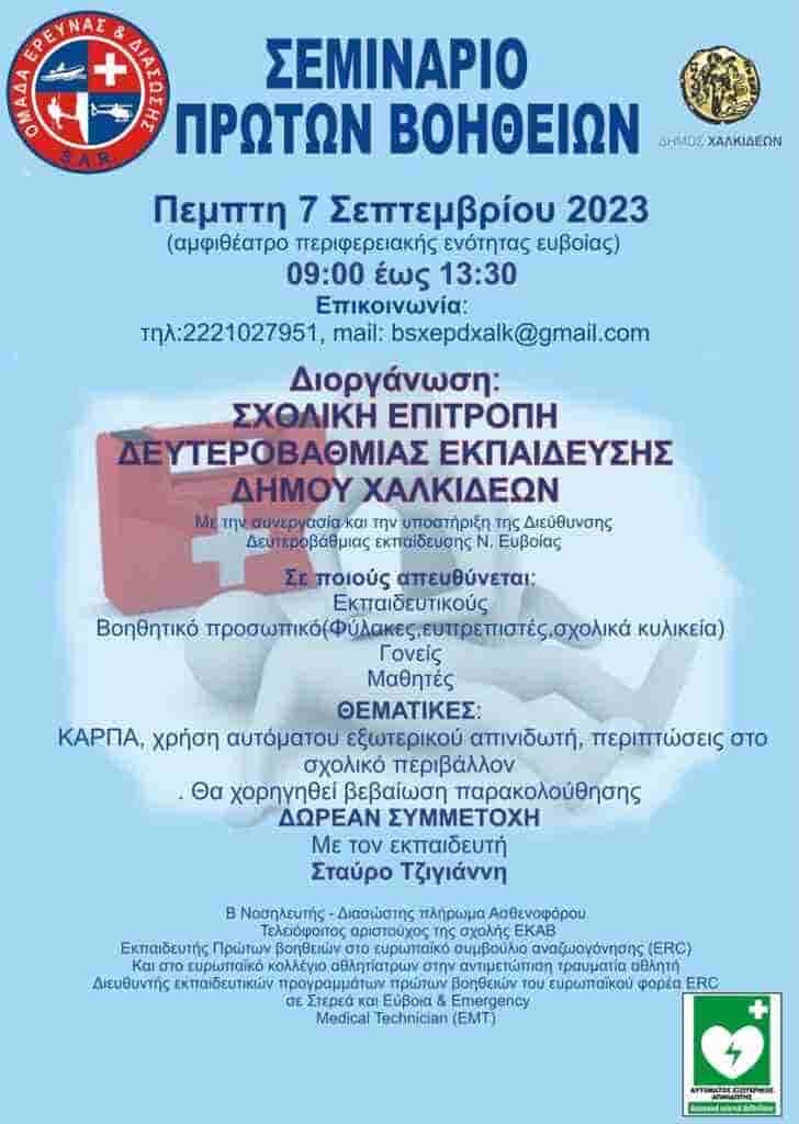 Σεμινάριο Πρώτων Βοηθειών, ΚΑΡΠΑ και χρήση αυτόματου εξωτερικού απινιδωτή, για περιπτώσεις στο σχολικό περιβάλλον, διοργανώνει ο Δήμος Χαλκιδέων, μέσω της Σχολικής Επιτροπής Δευτεροβάθμιας Εκπαίδευσης Δήμου Χαλκιδέων, σε συνεργασία με την Ομάδα Έρευνας και Διάσωσης και με την υποστήριξη της Διεύθυνσης Δευτεροβάθμιας Εκπαίδευσης Ν. Εύβοιας.
