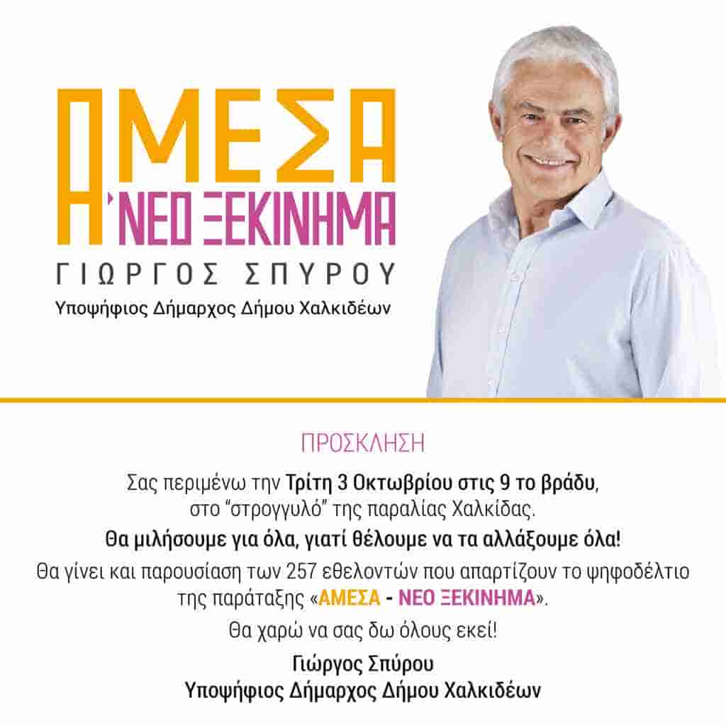 Kεντρική εκδήλωση του συνδυασμού “Άμεσα Νέο Ξεκίνημα” θα πραγματοποιηθεί την Τρίτη 3 Οκτωβρίου 2023 και ώρα 21.00 στο στρογγυλό της παραλίας Χαλκίδας, όπου θα μιλήσει ο υποψήφιος Δήμαρχος Δήμου Χαλκιδέων Γιώργος Σπύρου και θα παρουσιαστούν οι 257 υποψήφιοι όλων των Δημοτικών Ενοτήτων.