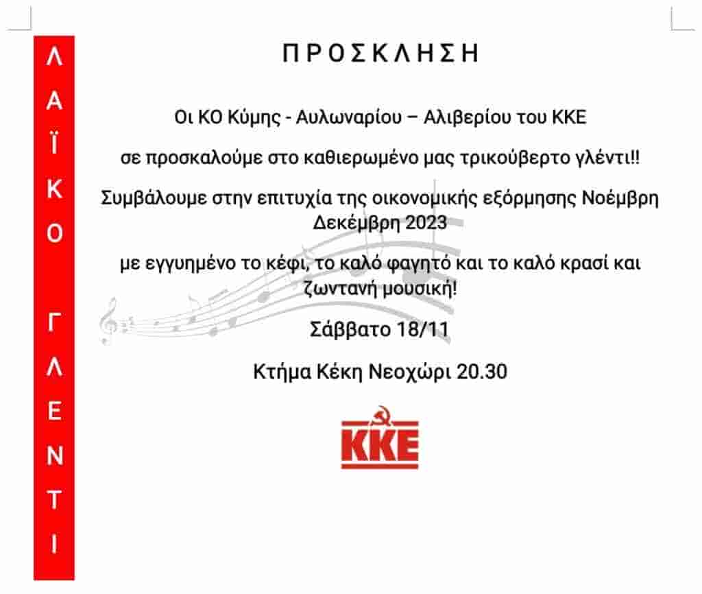 Οι Κομματικές Οργανώσεις Κύμης, Αυλωναρίου και Αλιβερίου του ΚΚΕ διοργανώνουν λαϊκό γλέντι, στα πλαίσια της οικονομικής εξόρμησης του ΚΚΕ, το Σάββατο 18 Νοέμβρη, στις 20:30, στο “Κτήμα Κέκη” στο Νεοχώρι.