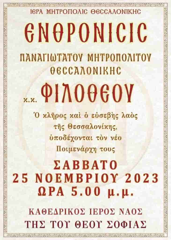 Πλήθος ευσεβών και Ευβοέων παρευρέθηκαν στην Ενθρόνιση του Νέου Παναγιωτάτου Μητροπολίτου Θεσσαλονίκης κ.κ Φιλόθεου που πραγματοποιήθηκε σήμερα Σάββατο 25 Νοεμβρίου, στον Ιερό Καθεδρικό και Προσκυνηματικό Ναό Της Του Θεού Σοφίας Θεσσαλονίκης.