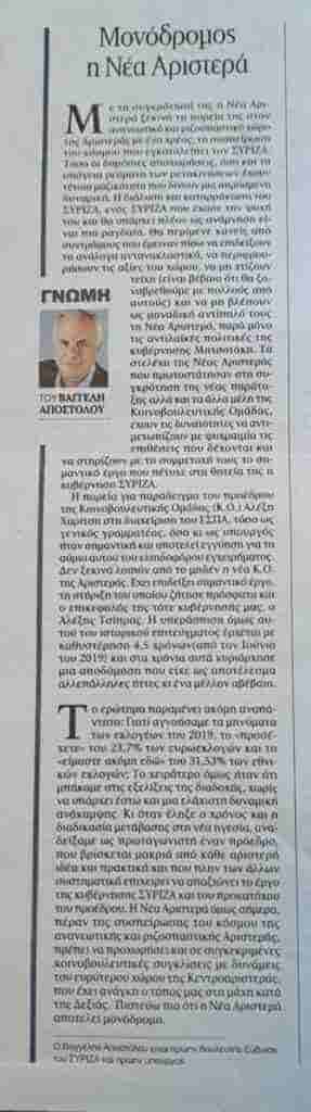 Ο κ. Βαγγέλης Αποστόλου, πρώην βουλευτής Εύβοιας του ΣΥΡΙΖΑ και πρώην Υπουργός , στην εφημερίδα ΤΑ ΝΕΑ την Τρίτη 12/12/2023