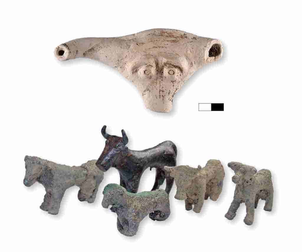 Χάλκινα ειδώλια ταύρου και κριαριού, 9ος-8ος αι. π.Χ.; Κεφαλή πήλινου τροχήλατου ειδωλίου ταύρου, Mυκηναϊκή περίοδος