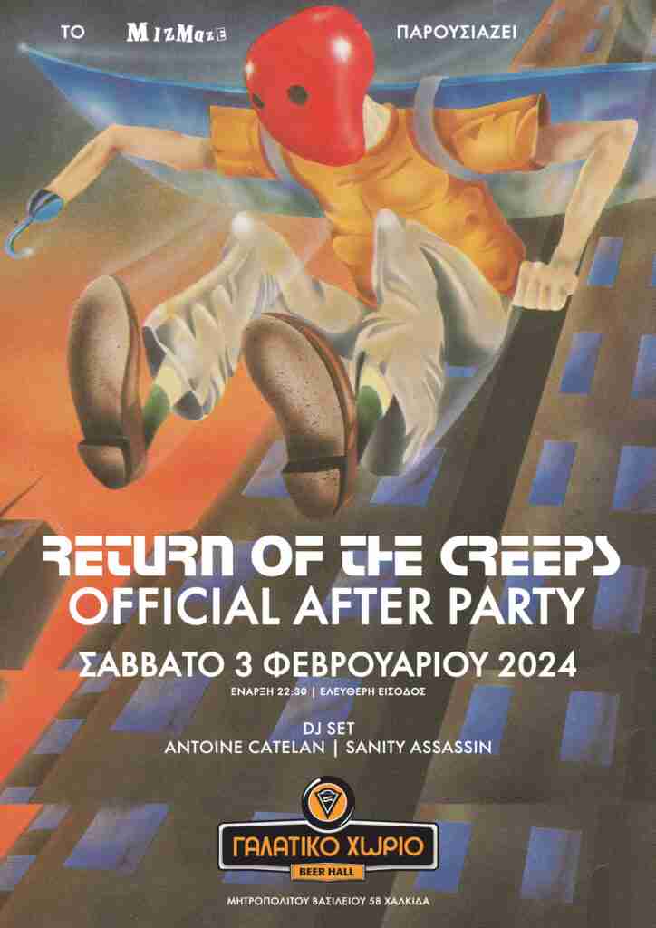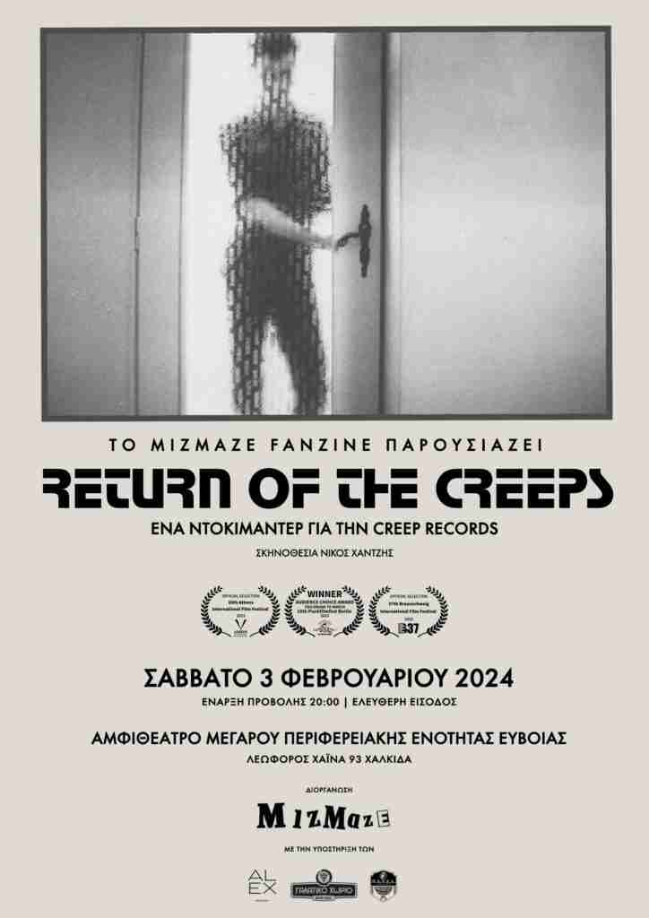 To Mizmaze Fanzine φιλοξενεί για πρώτη φορά στην πόλη της Χαλκίδας το μουσικό ντοκιμαντέρ Return of the Creeps! Λίγους μήνες μετά την παγκόσμια πρεμιέρα του στο Punkfilmfest Berlin στο Βερολίνο, όπου απέσπασε το βραβείο κοινού, και αμέσως μετά την συμμετοχή του στα Διεθνή Κινηματογραφικά Φεστιβάλ Αθήνας (Νύχτες Πρεμιέρας) και Μπράουνσβαϊγκ, το Return of the Creeps πραγματοποιεί την έξοδό του στις κινηματογραφικές αίθουσες και ταξιδεύει σε διάφορες πόλεις της Ελλάδας. Από τον δημιουργό του Music For Ordinary Life Machines, Νίκο Χαντζή, ένα νέο μουσικό ντοκιμαντέρ ξετυλίγεται στο άσπρο πανί και έρχεται να σας διηγηθεί κάτι από τα σκοτεινά μουσικά 80’s. Ιστορίες 33 και 45 στροφών, ιστορίες με κειμήλια και εικόνες που μένουν σε κόντακ χαρτί! Ένα ντοκιμαντέρ για την Creep Records, μία από τις πρώτες και επιδραστικότερες ανεξάρτητες δισκογραφικές εταιρείες στην Ελλάδα.