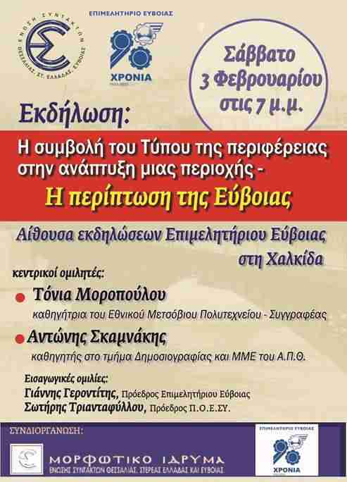 Η Ένωση Συντακτών Ημερήσιων Εφημερίδων Θεσσαλίας, Στερεάς Ελλάδας και Εύβοιας (ΕΣΗΕΘΣτΕΕ), το Μορφωτικό της Ίδρυμα και το Επιμελητήριο Εύβοιας, συνδιοργανώνουν εκδήλωση με θέμα