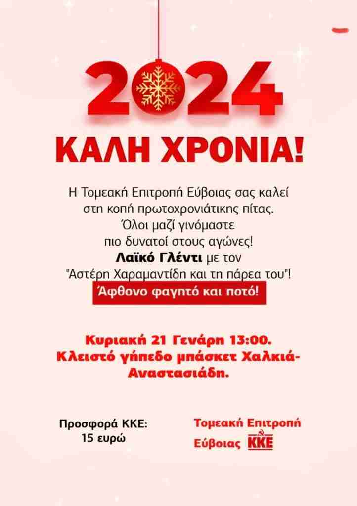 Η Τομεακή Επιτροπή Εύβοιας του ΚΚΕ σας καλεί στην κοπή πρωτοχρονιάτικης πίτας και το λαϊκό γλέντι που διοργανώνει με τον “Αστέρη Χαραμαντίδη και την παρέα του”.