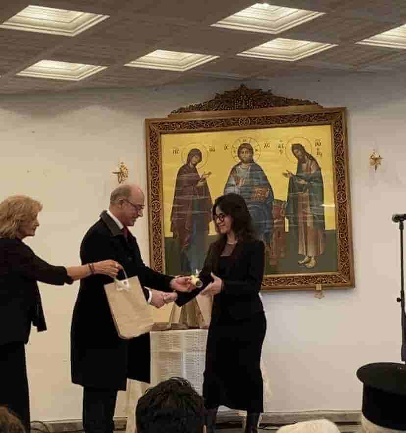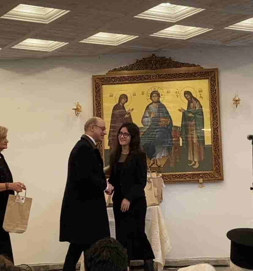 Ανάμεσα στους βραβευόμενους αριστούχους ήταν και η μαθήτρια της β΄ τάξης Λυκείου Ιφιγένεια Αγγελοπούλου την οποία είχε την ιδιαίτερη χαρά να της απονείμει το βραβείο ο πατέρας της κ. Παναγιώτης Αγγελόπουλος, ιατρός καρδιολόγος και Εντεταλμένος Σύμβουλος του δήμου Κύμης Αλιβερίου.