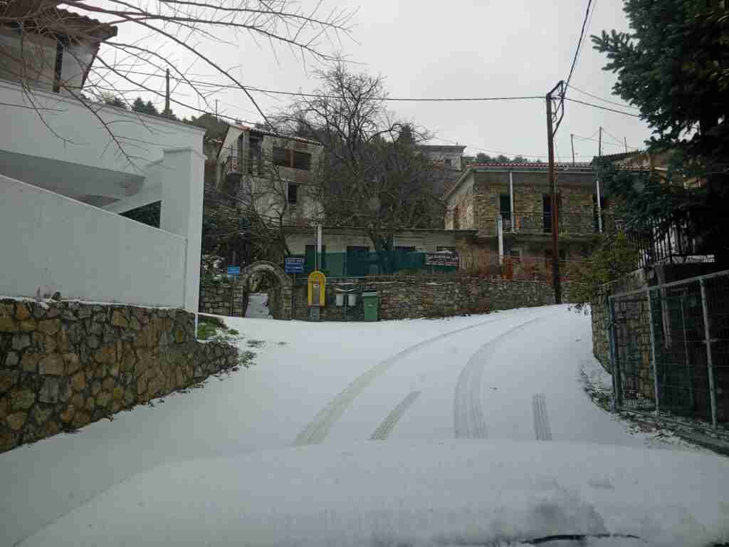 Η Πρόεδρος κα Αργύρη αναφέρει : “Επιτέλους χειμώνιασε! Είχαμε χιονόπτωση για δυο ώρες περίπου τις πρώτες πρωινές ώρες και το χιόνι στρώθηκε παντού . Δεν είναι μεγάλη η ποσότητα του χιονιού και δεν υπάρχει κάποιο πρόβλημα. Οι δρόμοι είναι ανοιχτοί και τα μηχανήματα του δήμου είναι συνέχεια εδώ στο χωριό. Πριν αρκετές ώρες σταμάτησε να πέφτει χιόνι. Έχει έντονο κρύο και πολύ συννεφιά μόνο.