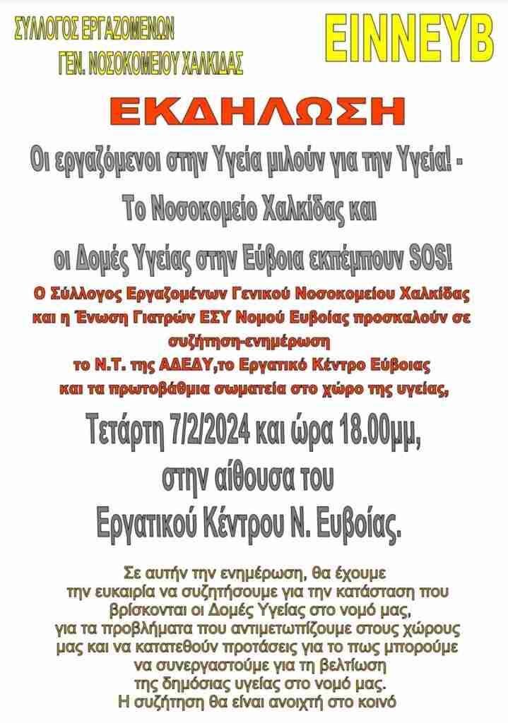 «Οι εργαζόμενοι στην Υγεία συζητούν για την Υγεία – Οι δομές υγείας στην Εύβοια και το Νοσοκομείο Χαλκίδας εκπέμπουν sos!» την Τετάρτη 7/02/2024 και ώρα 18.00μμ, στην αίθουσα του Εργατικού Κέντρου Ν. Ευβοίας.