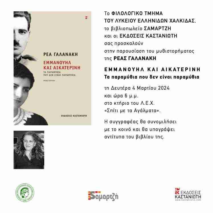 Το Φιλολογικό τμήμα του Λυκείου των Ελληνίδων Χαλκίδας, το βιβλιοπωλείο Σαμαρτζή και οι εκδόσεις Καστανιώτη σας προσκαλούν στην παρουσίαση του μυθιστορήματος της Ρέας Γαλανάκη