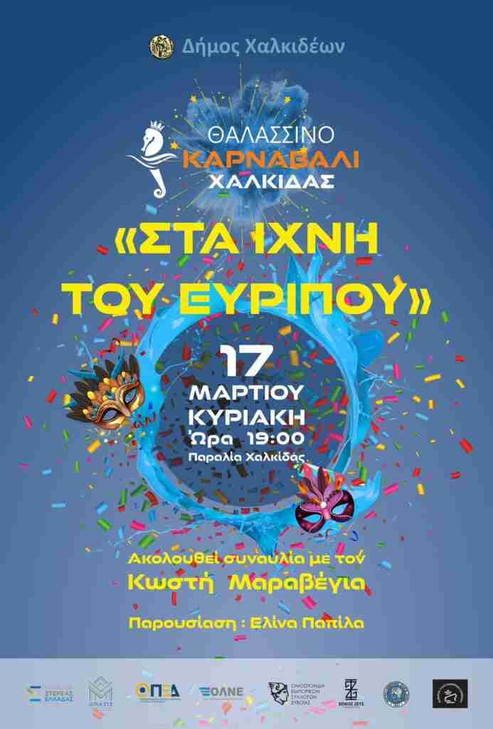 Μοναδικό, φαντασμαγορικό κι ασυναγώνιστο το Θαλασσινό Καρναβάλι Χαλκίδας 2024 . Την Κυριακή 17 Μαρτίου η Τελετή λήξης «Στα ίχνη του Ευρίπου» έρχεται με ένα υπερθέαμα που δεν έχει ξαναγίνει να συνταράξει τα νερά του Ευβοϊκού στο στενό του Ευρίπου. Την ευφάνταστη ατμόσφαιρα θα πλαισιώνει συναυλία με τον Κωστή Μαραβέγια και κάτι επίσης απαραίτητο δείτε εδώ όλες τις Κυκλοφοριακές ρυθμίσεις. Θέσεις Σαμαρειτών και χώρους Ελεύθερης στάθμευσης.
