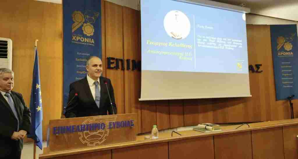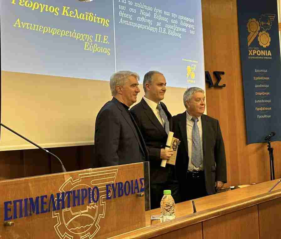 Στην λαμπερή εκδήλωση που πραγματοποίησε το Επιμελητήριο της Εύβοιας την Παρασκευή 15 Μαρτίου, παρουσία του Υπουργού Υγείας Άδωνι Γεωργιάδη, καλωσορίζοντας το νέο έτος με την κοπή της πρωτοχρονιάτικης πίτας, απένειμε τιμητικές διακρίσεις σε στελέχη που έχουν συμβάλει με την εργασία τους, στην πορεία και την ανάπτυξη της Εύβοιας. Μεταξύ αυτών τιμητική πλακέτα απονεμήθηκε και στον Αντιπεριφερειάρχη Π.Ε Εύβοιας κ. Γεώργιο Κελαϊδίτη, ενώ την απονομή έκανε ο Βουλευτής Εύβοιας κ. Σίμος Κεδίκογλου.