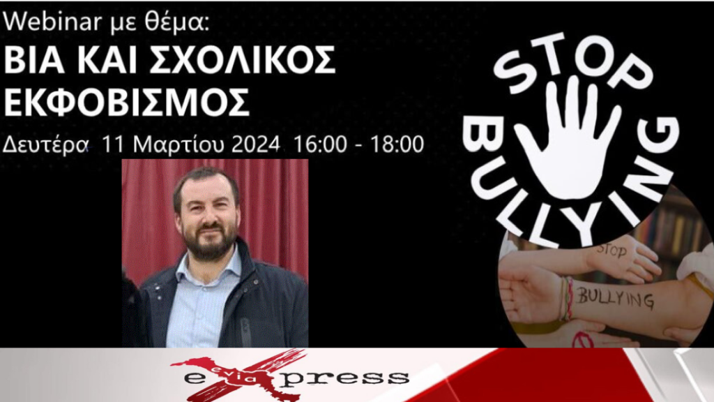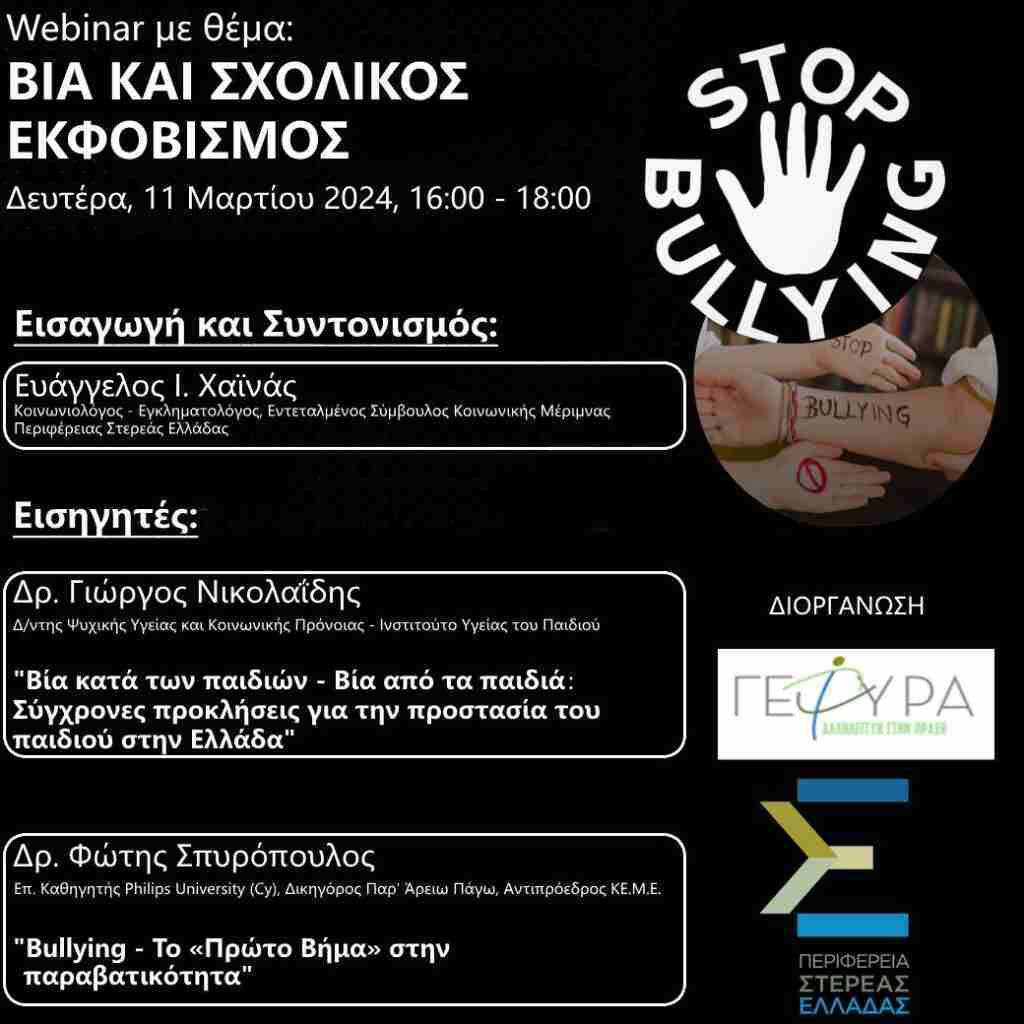 Το Περιφερειακό Παρατηρητήριο Κοινωνικής Ένταξης Περιφέρειας Στερεάς Ελλάδας – Δομή Γέφυρα διοργανώνει τη Δευτέρα, 11 Μαρτίου 2024, κατά τις ώρες 16:00-18:00, ανοικτό δωρεάν Webinar με θέμα: «Βία και σχολικός εκφοβισμός».