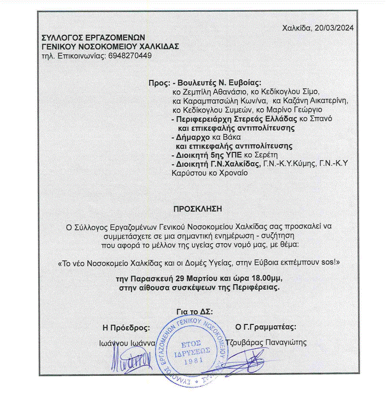 Την Παρασκευή 29/03 και ώρα 6:00 μμ, στην αίθουσα συσκέψεων της Περιφέρειας, η Πρόεδρος Πρόεδρος Συλλόγου Εργαζομένων και τα μέλη, προσκαλούν όλους τους θεσμικούς φορείς του τόπου, προκειμένου να γίνει συζήτηση σχετικά με το νέο νοσοκομείο και τις δομές υγείας του νομού, οι οποίες εκπέμπουν SOS.