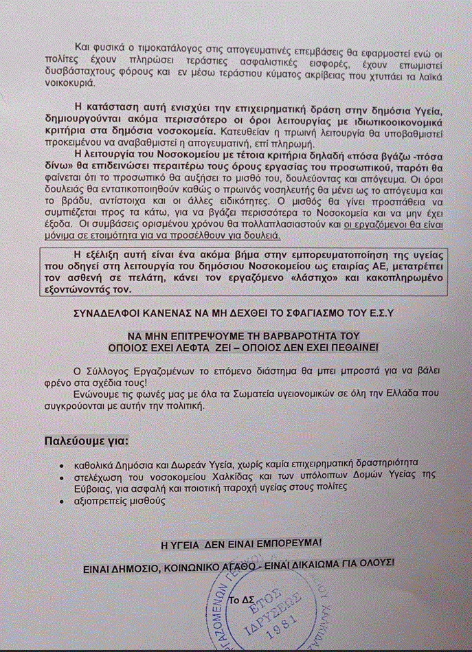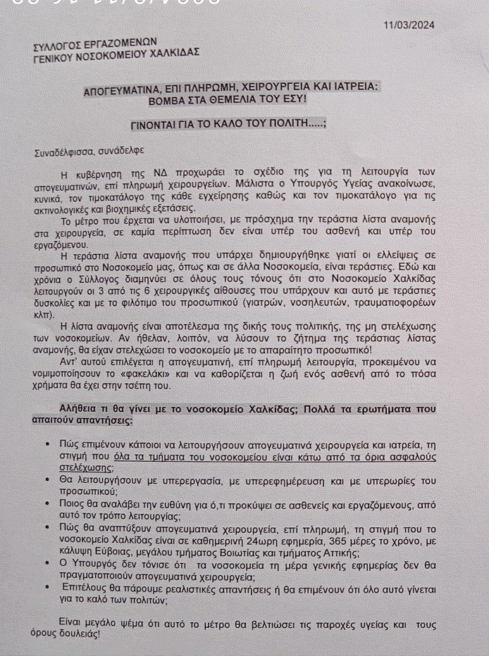 Αναλυτικά ο Σύλλογος των Εργαζομένων του Νοσοκομείου Χαλκίδας αναφέρει σε σχετικό Δελτίο Τύπου.