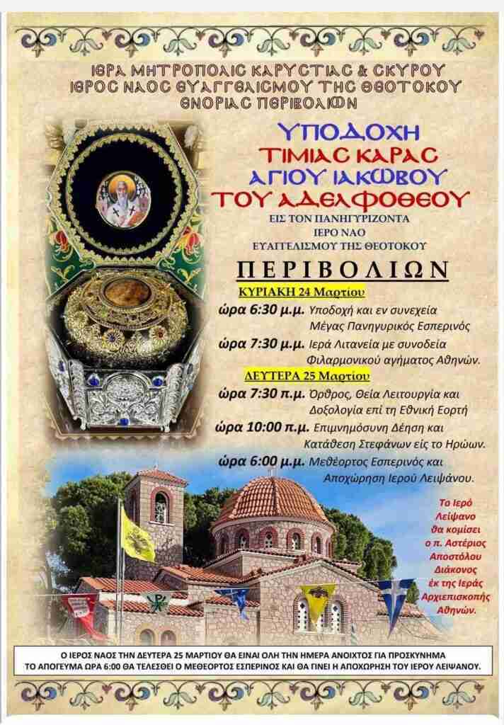 Η Ιερά Μητρόπολη Καρυστίας και Σκύρου, υποδέχεται την Τίμια Κάρα του Αγίου Ιακώβου του Αδελφόθεου στον πανηγυρίζοντα Ιερό Ναό του Ευαγγελισμού της Θεοτόκου της Ενορίας Περιβολίων, την Κυριακή 24 Μαρτίου παραμονή της μεγάλης εορτής .