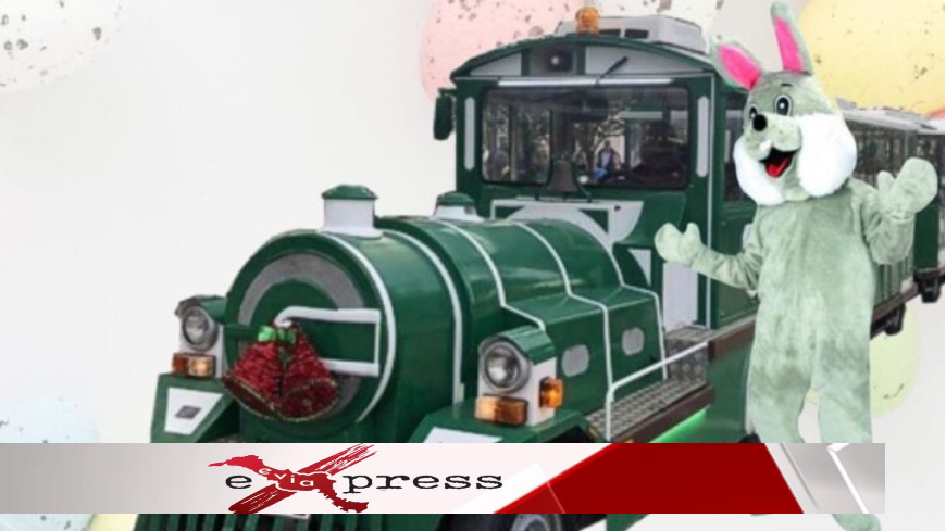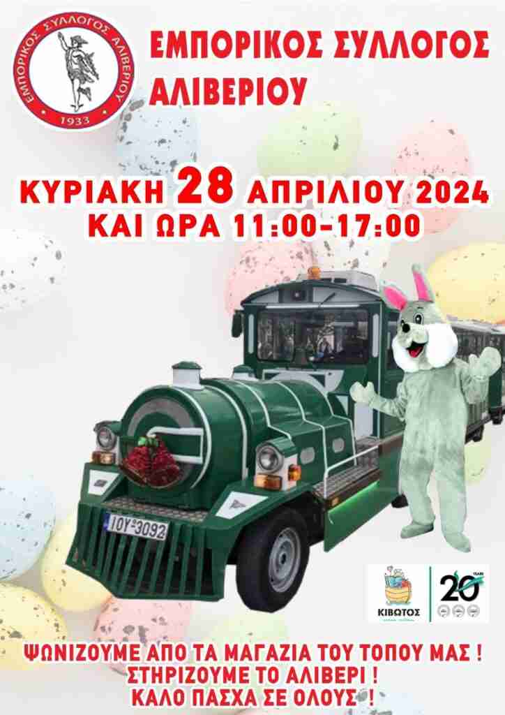 Ετοιμαστείτε ! Έρχεται και πάλι το Πάσχα και όπως πια έχει καθιερωθεί στο Αλιβέρι από τον Εμπορικό Σύλλογο στις 28 Απριλίου καταφτάνει και το τρένο που θα αναλάβει να χαρίσει σε μικρούς και μεγάλους εκπληκτικές βόλτες. Μαζί του θα καταφτάσει και ένας λούτρινος λαγός, παιχνιδιάρης και χαμογελαστός, πανέμορφος και πανέτοιμος κι αυτός για πολλές αναμνηστικές φωτογραφίσεις.