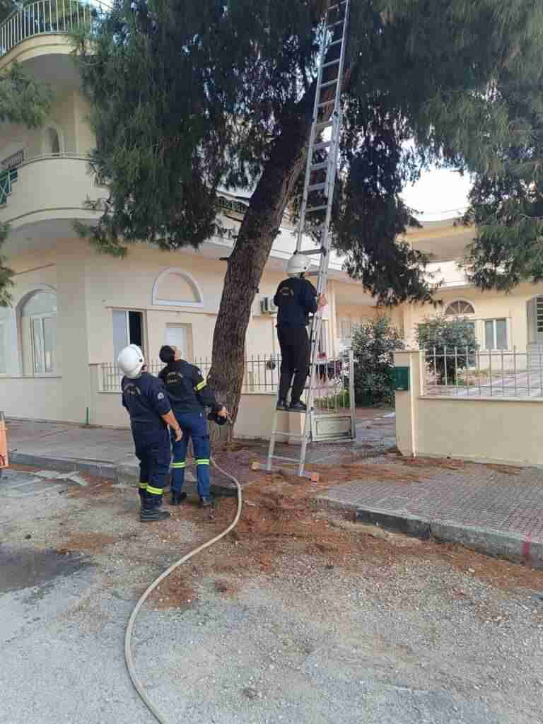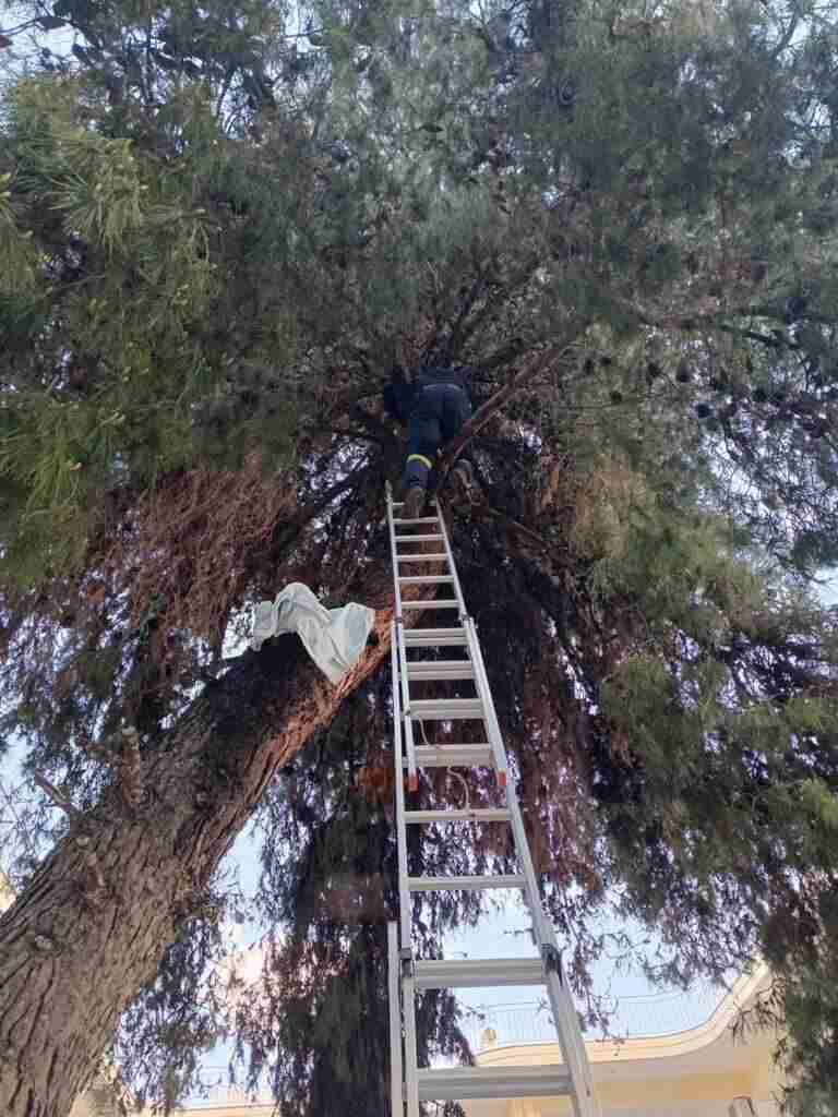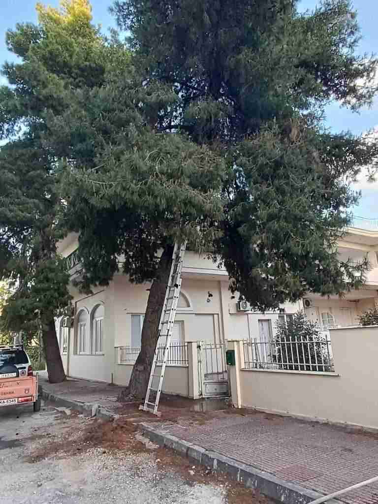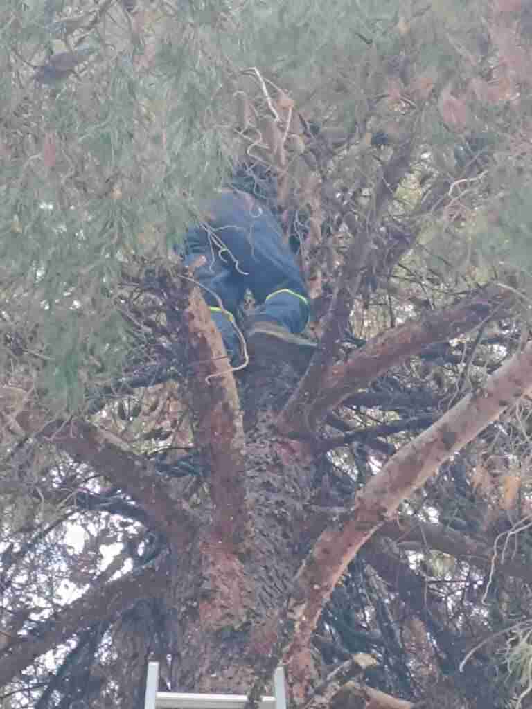 Φτάνοντας διαπιστώσαμε ότι μια γάτα δεσποζόμενη χρώματος τζίντζερ, είχε ανέβει σε ένα πεύκο ύψος 12 m και είχε εγκλωβιστεί δύο ημέρες στην κορυφή του δέντρου και απευθείας ξεκίνησαν ενέργειες για τον απεγκλωβισμό του ζώου.